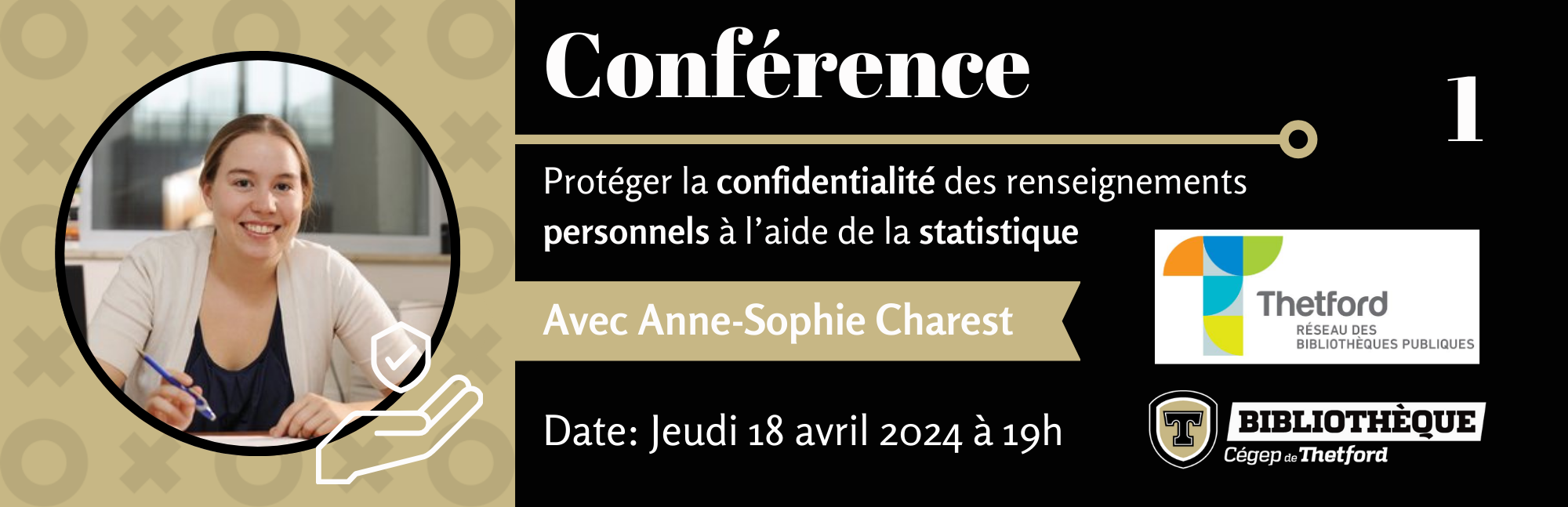 Ce billet devait bien représenter la conférence d’Anne-Sophie Charest, portant sur le thème de la confidentialité des renseignements personnels. Réalisé dans Canva, ce billet est aux couleurs du Cégep de Thetford et présente la sécurité et les données par des éléments subtils et bien choisis.